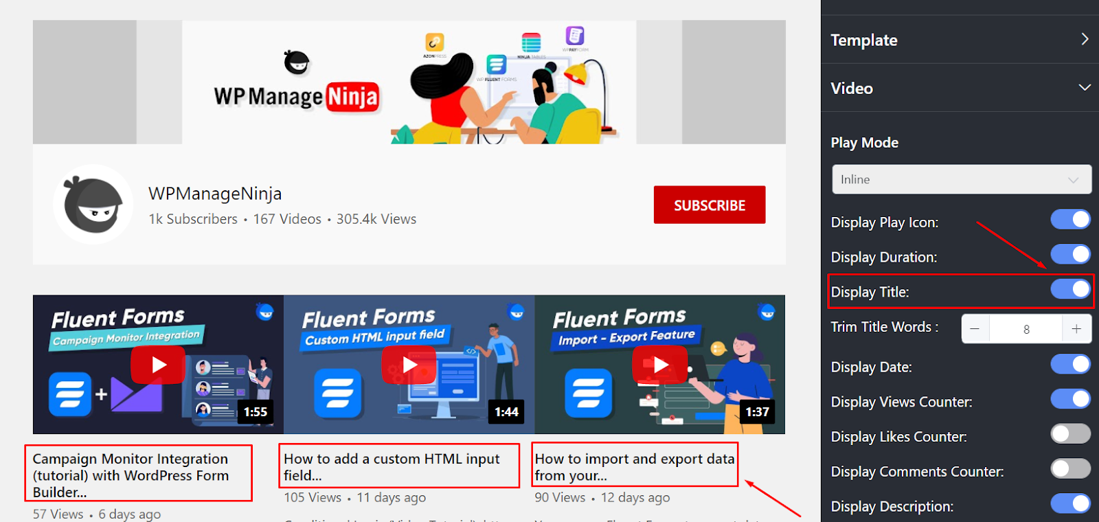 WP Social Ninja has a stunning YouTube Feed. It has a Play Mode feature that contains four types; Inline, Gallery, Popup, and Redirect to YouTube.